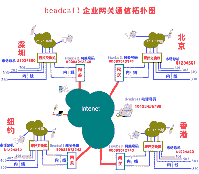 5,傳統(tǒng)的固話或手機(jī)也可通過當(dāng)?shù)氐腍eadcall的語音網(wǎng)關(guān)撥打全球的headcall電話及另一國家或地區(qū)的企業(yè)(有Headcall語音網(wǎng)關(guān))的總機(jī),這部分的費(fèi)用除了你要向當(dāng)?shù)仉娦沤患{市話費(fèi)外,其余都為零。(PSTN――Headcall)