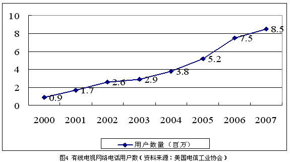 隨著有線電視用戶數(shù)量逐漸達(dá)到飽和,有線電視公司也在積極尋找新的利潤增長點(diǎn)。在過去的7年中,有線電視公司投入了高達(dá)800億美元的資金用于網(wǎng)絡(luò)升級(jí)改造,現(xiàn)在,大部分有線電視網(wǎng)絡(luò)已經(jīng)可以提供包括寬帶接入、本地和長途電話、數(shù)字電視、視頻點(diǎn)播等在內(nèi)的一攬子服務(wù)。到2004年末,有線電視公司已經(jīng)擁有超過380萬的本地電話用戶。根據(jù)美國電信工業(yè)協(xié)會(huì)的估算,到2007年,全美將會(huì)有超過800萬的用戶選擇基于有線電視網(wǎng)的基本電信業(yè)務(wù),如圖4所示。