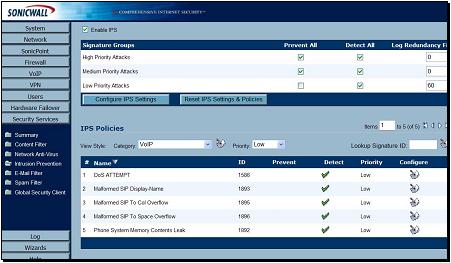 SonicWALL入侵檢測服務(wù)(IPS)能夠為VoIP協(xié)議應(yīng)用層提供全面保護。IPS集成了一個可配置的超高性能掃描引擎,配合動態(tài)更新和擁有1900多攻擊和漏洞簽名的數(shù)據(jù)庫,可以保護網(wǎng)絡(luò)免受最復(fù)雜的木馬和變形威脅的影響。SonicWALL已經(jīng)利用一系列VoIP相關(guān)的簽名來擴展其IPS簽名數(shù)據(jù)包,可以防止惡意業(yè)務(wù)流到達受保護的VoIP電話和服務(wù)器。