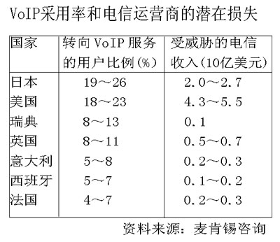 新興的寬帶運(yùn)營商紛紛推出寬帶電話業(yè)務(wù),對傳統(tǒng)電信運(yùn)營商的話音業(yè)務(wù)構(gòu)成了嚴(yán)重威脅。如:美國的AOL、Seednet等互聯(lián)網(wǎng)服務(wù)提供商和MSN、Yahoo等網(wǎng)絡(luò)內(nèi)容提供商等都借助VoIP積極進(jìn)入話音服務(wù)市場。