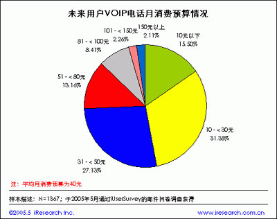 下面再讓我們看看用戶對網(wǎng)絡(luò)電話消費(fèi)預(yù)算情況,根據(jù)iResearch艾瑞市場咨詢《VOIP報(bào)告》數(shù)據(jù)顯示,月消費(fèi)預(yù)算10元以下的用戶占VOIP用戶的15%,10-30元的占31.3%,31-50元的占27.1%,51-80元的占13.2%,80元以上的占12.8%,據(jù)此計(jì)算未來用戶網(wǎng)絡(luò)電話平均月消費(fèi)預(yù)算為40元。