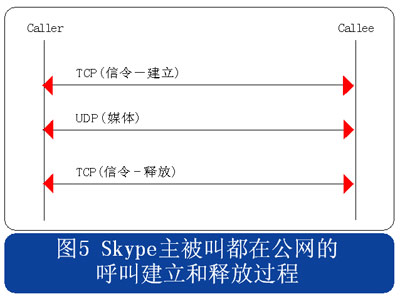 從上述流程圖可見,Skype的呼叫信令都采用TCP封裝,而媒體流則使用UDP封裝,當有任何一方用戶位于限制UDP包的防火墻內(nèi)時,媒體流就會采用TCP封裝。另外當Skype用戶至少有一方位于私網(wǎng)內(nèi)時,所有的信令和媒體消息都經(jīng)過一個或多個中間節(jié)點轉發(fā)。此時無需擔心用戶通話的媒體流因為經(jīng)過中間節(jié)點轉發(fā)而被竊聽,因為Skype采用了對消息進行端到端加密的機制。