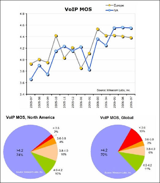 Minacom最新調研表明,一年來VoIP電話質量和聯(lián)結速度都超過傳統(tǒng)標準公共開關電話。電話質量得分Mean Opinion Score (MOS)數(shù)據表明,VoIP得分是4.2,而標準公共開關電話得分3.9。85%的IP電話質量和穩(wěn)定性都超過標準公共開關電話。對電話聯(lián)結速度,VoIP的MOS得分是平均8.2秒,傳統(tǒng)電話時間更長,平均為8.9秒。這里的IP電話服務指商業(yè)企業(yè)級應用,不是MSN,雅虎通之類免費IP電話個人應用。比較而言,北美IP電話質量優(yōu)于歐洲。