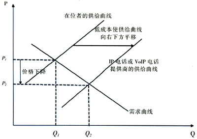 與傳統(tǒng)以電路交換為主的電話網(wǎng)相比,分組交換技術(shù)使得提供IP電話或VoIP電話所需的交換設(shè)備數(shù)量大大減少,而且部分提供IP電話或VoIP電話的運(yùn)營商并沒有鋪設(shè)上下行用戶端的“最后一公里”線路。由于沒有全程布網(wǎng),在網(wǎng)間結(jié)算費(fèi)較低甚至不結(jié)算的情況下,其運(yùn)營成本自然遠(yuǎn)低于本地運(yùn)營商,從而使其供給曲線與本地運(yùn)營商的供給曲線相比向右下方偏移,因而有能力推出價格遠(yuǎn)低于傳統(tǒng)語音的IP電話或VoIP電話,見圖2。