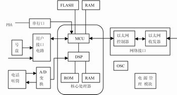 VoIP話機的構(gòu)造如圖3所示。其用戶接口部分與普通話機無異,顯示器用來顯示相關(guān)的信息,如發(fā)起呼叫時所撥的號碼、來電顯示等。此外,VoIP話機可以由串行口與個人數(shù)字助理(PDA)設(shè)備相連,實現(xiàn)軟件升級、自動撥號等功能。話音接口的功能是實現(xiàn)話音模擬信號與標準64Kbit/s
