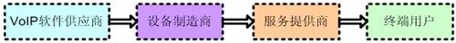 如圖2所示,VoIP產(chǎn)業(yè)價(jià)值鏈的各個(gè)環(huán)節(jié)包括軟件供應(yīng)商、設(shè)備制造商、系統(tǒng)集成商、服務(wù)提供商及終端用戶。