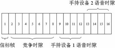 根據(jù)設(shè)計的特點,無線語音網(wǎng)關(guān)同手持設(shè)備間的無線網(wǎng)絡(luò)采用星型拓?fù)浣Y(jié)構(gòu),無線語音網(wǎng)關(guān)作為無線個域網(wǎng)的協(xié)調(diào)器同手持設(shè)備進行信息交互。IEEE802.15.4MAC層分為使用信標(biāo)幀和不使用信標(biāo)幀兩種工作模式,本設(shè)計采用使用信標(biāo)幀同步的超幀結(jié)構(gòu),由無線語音網(wǎng)關(guān)發(fā)送信標(biāo)幀同步無線手持設(shè)備的數(shù)據(jù)傳輸。本設(shè)計中超幀長30ms,等分為16個時隙,每個時隙為1.875ms。信標(biāo)幀在時隙1發(fā)送,時隙2到時隙8為競爭時隙,使用時隙CSMA-CA算法傳輸命令幀和應(yīng)答幀。時隙9到時隙16固定分配給兩個手持設(shè)備作為上下行語音數(shù)據(jù)通道。上下行各兩個時隙的分配可以滿足經(jīng)
