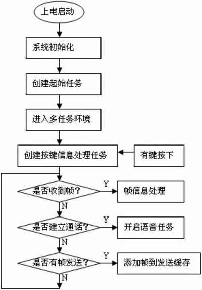 當(dāng)手持設(shè)備上電啟動后,其工作流程如圖7示。首先進行的是系統(tǒng)的初始化,包括處理器初始化,操作系統(tǒng)mC/OS-II初始化,LCD,鍵盤,射頻模塊等的初始化。之后建立起始任務(wù)并通過OSStart()函數(shù)進入多任務(wù)環(huán)境。此時起始任務(wù)占用CPU資源,在起始任務(wù)中,建立按鍵信息處理任務(wù)并通過信號量機制掛起。然后判斷是否收到來自無線語音網(wǎng)關(guān)的幀,如果有,調(diào)用frame_deal()函數(shù)處理幀信息,在該函數(shù)中調(diào)用call_command_deal()完成無線網(wǎng)內(nèi)部會話信令的處理。接著判斷通話是否建立,如果建立則創(chuàng)建語音任務(wù),在語音進程中使能PCM編解碼芯片,并進行g(shù).726壓縮編碼。最后判斷是否有幀需要發(fā)送給無線語音網(wǎng)關(guān),如果有則把幀添加到發(fā)送緩存,等待發(fā)送時隙到來。這一過程完成以后重新跳到判斷是否收到來自無線語音網(wǎng)關(guān)的幀,重復(fù)以上過程。如果有鍵盤中斷,將會釋放一個信號量,該信號量將解掛按鍵信息處理任務(wù)。該任務(wù)對鍵盤輸入信息進行處理。