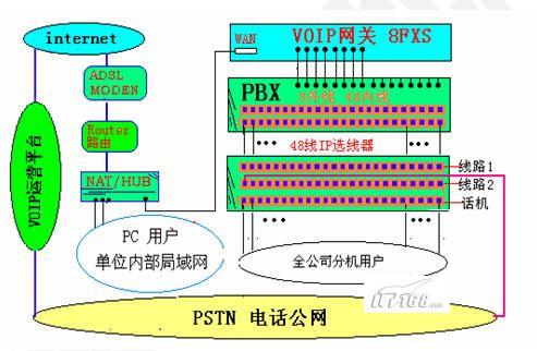 建議采用“EIA2000系列語音網(wǎng)關(guān)”,有單口、2口、4口、8口、16口等設(shè)備,可供選擇。所謂4口,即每設(shè)備有4個(gè)通訊接口,可4路同時(shí)通話,公司內(nèi)部電話通過集團(tuán)交換機(jī)接入語音網(wǎng)關(guān),且可新增網(wǎng)關(guān)自由擴(kuò)展。端口建議選擇全FXS口接入,每路雙向通話需要占用大約10-12KB,在實(shí)際使用中,每條ADSL線路可供10路同時(shí)通話,實(shí)現(xiàn)多人共享使用(在沒有大量數(shù)據(jù)傳輸?shù)那闆r下)。