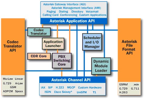 Asterisk具有傳統(tǒng)PBX無(wú)法比擬的優(yōu)點(diǎn),那就是其靈活性,可擴(kuò)展能力;Asterisk的擴(kuò)展能力是通過開放相應(yīng)的架構(gòu)和接口來(lái)實(shí)現(xiàn)的。這就意味著Asterisk是一個(gè)組件而不是一個(gè)成型的產(chǎn)品,Asterisk的核心提供了一個(gè)基本的可運(yùn)行環(huán)境,而外圍相應(yīng)的能力則可以通過加載和配置相關(guān)的插件和模塊來(lái)實(shí)現(xiàn)。