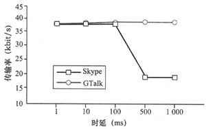ms時(shí)通話是可以接受的,時(shí)延為500 ms、1 000 ms時(shí)語(yǔ)音質(zhì)量就變得不可接受。對(duì)于Skype,時(shí)延對(duì)其服務(wù)質(zhì)量的影響更為明顯,如圖5所示,傳輸率從37.5