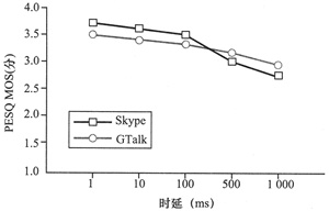 ms、100 ms時(shí)Skype的PESQ MOS高于GTalk,在時(shí)延為500 ms、1 000 ms時(shí)GTalk則略優(yōu)于Skype。
