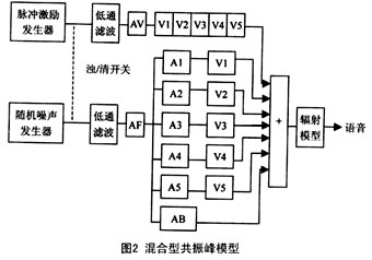 ----混 合 型 共 振 峰 模 型 在 級 聯(lián) 型 共 振 峰 合 成 模 型 中, 共 振 峰 濾 波 器 首 尾 相 接; 而 在 并 聯(lián) 型 模 型 中, 輸 入 信 號 先 分 別 通 過 幅 度 調 節(jié) 再 加 到 每 一 個 共 振 峰 濾 波 器 上, 然 后 將 各 路 的 輸 出 疊 加 起 來。 將 兩 者 比 較, 對 于 合 成 聲 源 位 于 聲 道 末 端 的 語 音( 大 多 數(shù) 的 元 音), 級 聯(lián) 型 合 乎 語 音 產(chǎn) 生 的 聲 學 理 論, 并 且 無 需 為 每 一 個 濾 波 器 分 設 幅 度 調 節(jié); 而 對 于 合 成 聲 源 位 于 聲 道 中 間 的 語 音( 大 多 數(shù) 清 擦 音 和 塞 音), 并 聯(lián) 型 則 比 較 合 適, 但 是 其 幅 度 調 節(jié) 很 復 雜。 基 于 此 種 考 慮, 人 們 將 兩 者 結 合 在 一 起, 提 出 了 混 和 型 共 振 峰 模 型, 如 圖2 所 示。