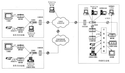 由于政府部門所跨的地域較廣,彼此之間的距離較遠,而且各級政府部門的會議較多,因此,利用修建好的信息高速公路建立一個基于IP網(wǎng)絡(luò)的視像會議系統(tǒng)具有一定的實用價值。這種系統(tǒng)既可以提高政府部門的辦公效率以及政府專用網(wǎng)絡(luò)的利用率,又可以節(jié)省政府部門的會議費用。以下介紹在IP寬帶網(wǎng)上構(gòu)建電視電話會議系統(tǒng)解決方案。