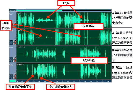 這里的結果顯示出,PSTN側收聽器接收到的噪音是如何被大大降低的,同時PSTN側說話的音量在無線側出現(xiàn)大聲的噪音期間被顯著地放大了。通過遍及全球的類似場合試驗,在應用Studio Sound之前和應用之后通話質量的不同已經(jīng)深刻為許多業(yè)務提供商所了解。