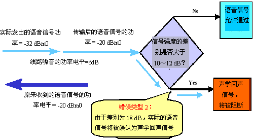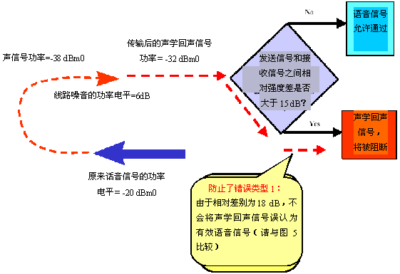 當通信鏈路的的另一端被設計為傳輸可變強度的信號時,"錯誤類型1"的影響會急劇增大。在這種情況下,根據(jù)功率電平的絕對差異來決定阻斷/允許信號的聲學回聲控制器會增大"錯誤類型1"出現(xiàn)的可能性。也就是說,使用絕對功率電平差異時,將聲學回聲信號誤認為有效語音信號的概率很大。