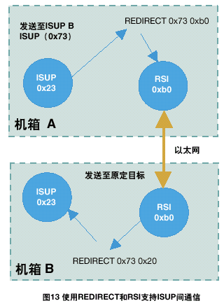 例如,一個(gè)雙ISUP系統(tǒng)應(yīng)該由兩個(gè)ISUP部分組成,每部分缺省module_id都為0x23。A方ISUP的配置數(shù)據(jù)表示另一個(gè)ISUP部分的module_id為0x73;因此,在A方將會(huì)有一個(gè)重定向的動(dòng)作來對(duì)經(jīng)過RSI發(fā)送往0x73的任何訊息重新定向。在B方,應(yīng)該有一個(gè)REDIRECT語句將B方RSI所接收的所有目標(biāo)為0x73的訊息路由到本地ISUP,標(biāo)識(shí)為0x23。具體情況如圖13所示。