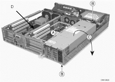 7. 抬起電源盒的基座,然后旋轉(zhuǎn)以便能將其放置到服務器單元外(這樣做不用斷開纜線,但操作時要小心,以保證纜線不受擠壓);