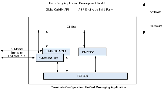 通過訪問計算機電話(CT)工業(yè)標準的ECTF H.100/H.110 CT Bus,利用DM/V-A多功能資源系列板卡,應用程序可以具備交換能力以及擴展到其他技術(shù)的能力,諸如網(wǎng)絡(luò)接口(DM/T或者DM/N系列),ATM連接,SS7,以及IP電話。
