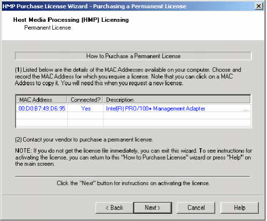5. 聯系你的廠家購買一個永久許可證。你必須提供從在4步中得到的MAC地址?色@得的許可證列表參見表3""HMP